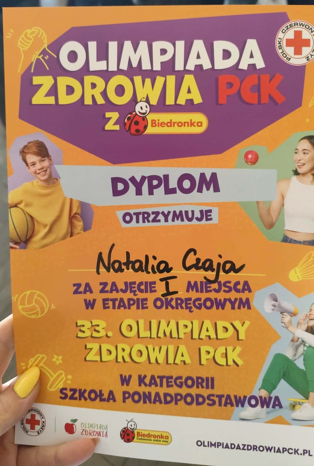 Z ogromną radością informujemy, że nasza uczennica Natalia Czaja (kl.3A1) zajęła I miejsce w etapie okręgowym Olimpiady Zdrowia PCK, który odbył się 10 kwietnia 2026 roku w Krakowie.